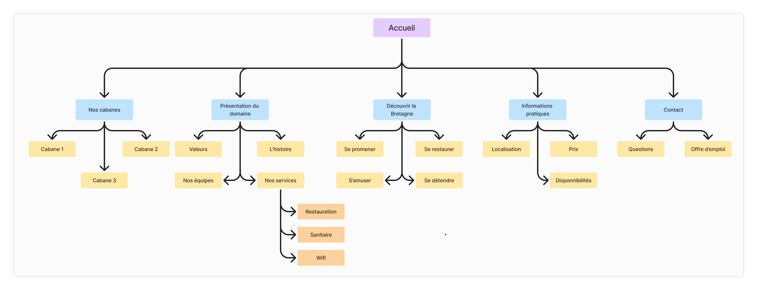 Pour l’arborescence j’ai décidé d’utiliser Figma. Concernant mes choix, j’ai intégré dans un premier temps les cabanes. La priorité pour Monsieur Deschamps est principalement de vendre et mettre en avant ses cabanes afin de donner envie aux prospects d’en louer une. Pour cela, j’ai décidé de créer une page mettant une page mettant en avant toutes les cabanes, ce qui permet très rapidement de retrouver toutes les cabanes mises en location ainsi que toutes les informations les concernant.