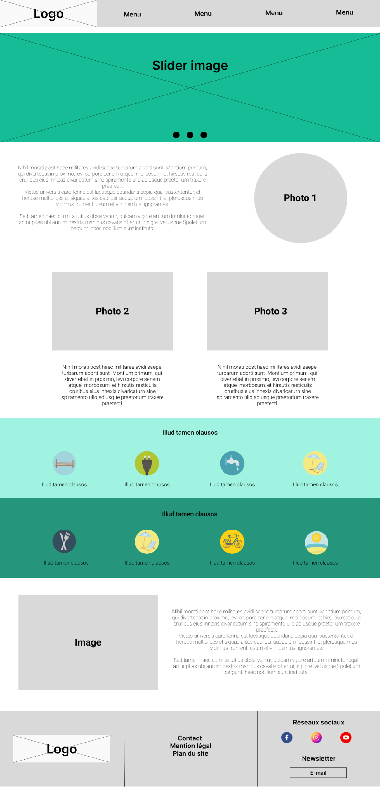 J’ai également fait le choix d’intégrer une partie équipement et options en dessous afin de montrer aux clients ce à quoi ils peuvent profiter en se rendant dans le lieu. Ces deux bandeaux sont accompagnés d’icônes comme indiqué précédemment dans le zoning. J’ai intégré une partie localisation du domaine annoncée par une partie image sur laquelle on intégrera un plan de la Bretagne et une rapide description.